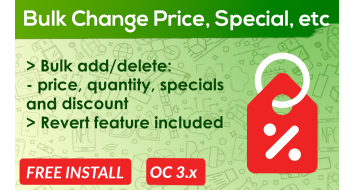 Quickly update price, special, discount and quantity Introduce: OpenCart Products Bulk Change Price, special, discount and quantity. ...